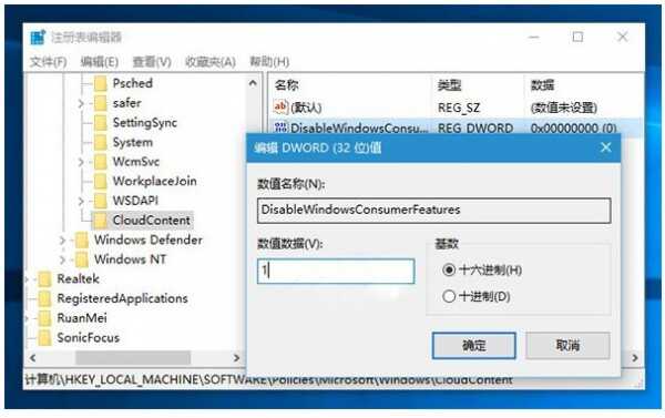 5、双击DisableWindowsConsumerFeatures,将其值设置为1,然后保存。