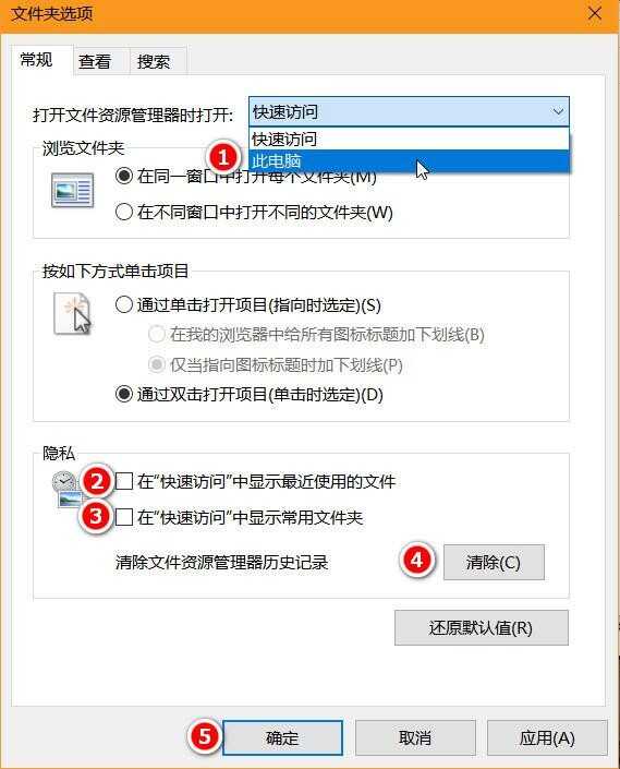 2、按照下图,依次选择“打开文件资源管理器时打开”此电脑,去除在“快速访问”中显示最近使用的文件与在“快速访问”中显示常用文件夹前面的对勾,并点击清除当前记录。最后点击确认或应用即可。