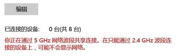 如果你的设备使用的5GHz 无线网络的话,那么创建的分享网络也是5GHz,此时一些老的移动设备不支持5GHz网络的话,是搜索不到的,不过Windows 10 会给予提醒,告知你这个情况。