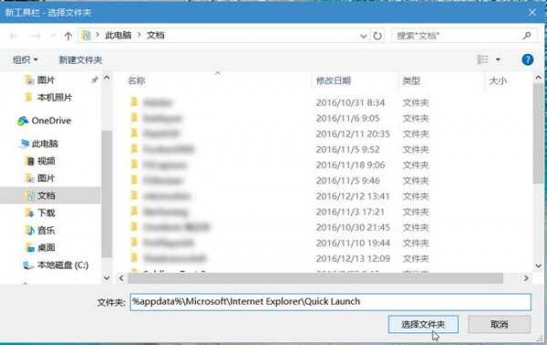 2、跳出“新增工具栏 – 选择文件夹”以后, 在空白字段中输入“%appdata%\Microsoft\Internet Explorer\Quick Launch”,然后单击〔选择文件夹〕。