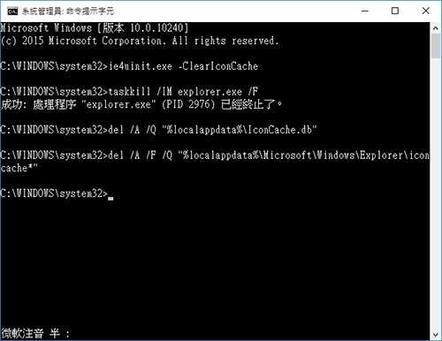 5. 接下来输入「del /A /F /Q “%localappdata%\Microsoft\Windows\Explorer\iconcache*”」单击[Enter]继续。