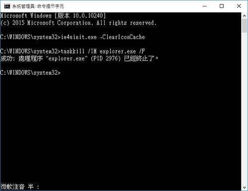 3. 接下来我们要先关闭系统界面,因此在执行此步骤前请先将所有正在进行的工作存盘并关闭。 然后在「命令提示字符」窗口中输入「taskkill /IM explorer.exe /F」,并单击[Enter],这时你会看到系统的所有界面都被关闭了,只剩此窗口。