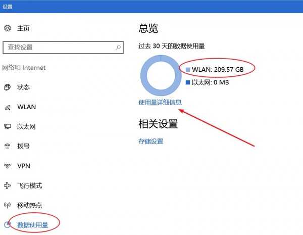 2、在“网络和Internet”界面的左侧,找到“数据使用量”,这时右侧就会显示你在30天内的数量使用总量了,如下图。如果你还使用了以太网连接的话,那么以太网的数据也会有变化。如果想要查看每款软件各自的数据消耗,点击“使用量详细信息”即可;