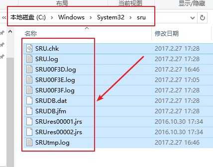 3、带电脑进入安全模式后,我们直接快捷键“Win+E”打开文件资源管理器,然后按照以下路径打开:C:\Windows\System32\sru ,将里面的文件全选后删除。注意:不是删除sru,只是删除里面的所有文件哦。