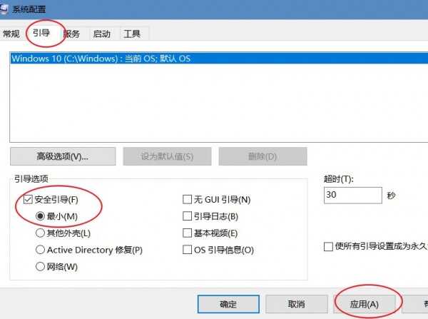 2、在打开的“系统配置”窗口中,选择“引导”,然后勾选“引导选项”中的“安全引导”,默认会选择“最小”,这时我们点击“应用”后确定,会弹出下面的窗口;