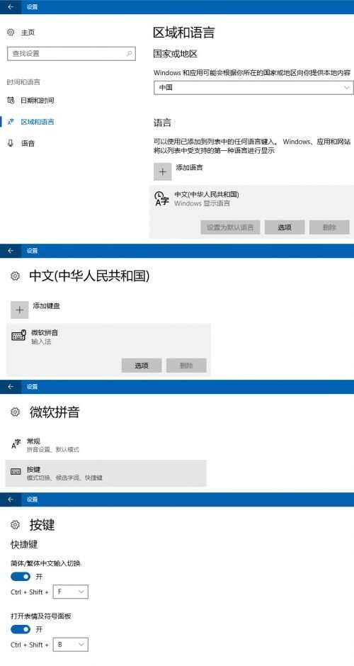 可在【设置】>【时间和语言】>【区域和语言】>【中文】选项>【微软拼音】选项>【按键】中设置,将按钮设为非激活的状态即可。