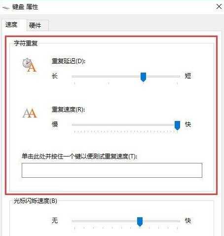3、打开的键盘属性设置中,就可以看到键盘速度设置了,包括重复延迟、重复速度快慢等等,如果您打字速度足够快,可以将重复延迟时间设置的更短一些,这样有利于提升打字速率,随后点击确定即可。