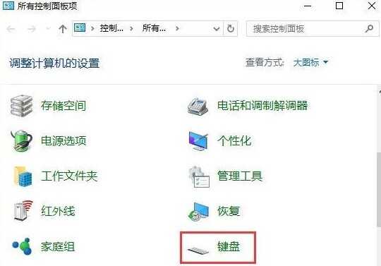 2、打开控制面板后,先将查看方式的类别选择为“大图标”,找到“键盘”并点击打开;
