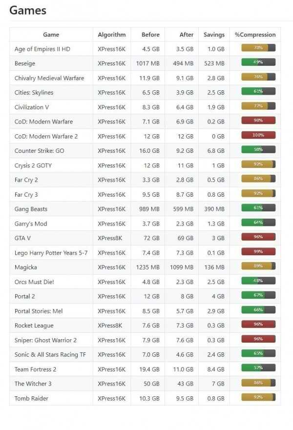 根据Reddit论坛上的网友反映,这个软件对于不同的游戏实际的效果可能会有所不同,有网友总结了自己25个游戏的压缩测试结果,并制作了一张表格。可以看到,压缩率最高的游戏《兽人必须死》达到了48%,但也有根本没法进行压缩的游戏《使命召唤8:现代战争2》,不过这个功能的确会给喜欢囤积游戏的玩家们节约不少空间。