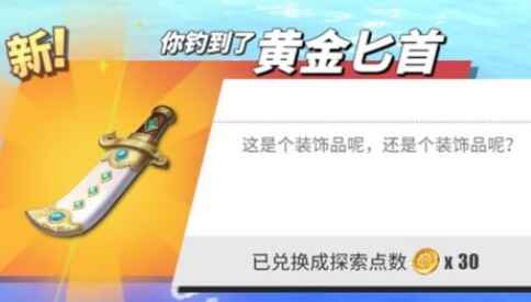 在游戏航海王的热血路线上,玩家在钓鱼时有机会钓到金匕首。金匕首可以换成金币和30点探索点,在背包里找到金匕首,然后选择,点击兑换,其他饰品道具也可以这样兑换。