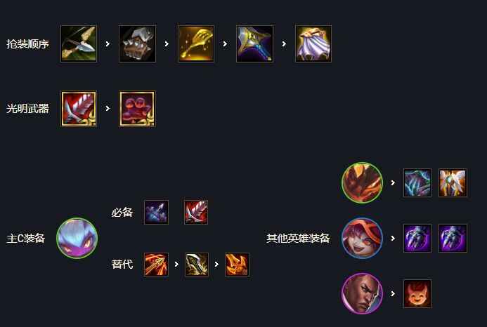先选可以抢攻速或者全套,小炮装备优先,喝血和轻语都必不可少,第三件可以根据上图选择,选金铲子,选中有金铲一定要拿,恶魔转是非常重要的。其它设备按上面的优先顺序分配,其余按需分配。
