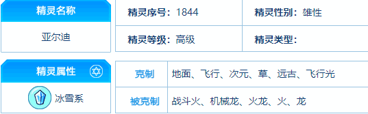 亚尔迪技能:抓:伤害40,PP35,果断:伤害零点,PP十,改变自己的精灵命中加一,雪拳:伤害55,PP35,超大雪球:伤害65,PP30,敌方精灵血量低于二分之一,伤害加倍,寒气流动:伤害零点,PP30,改变自己的精灵速度加一,组队时可以向任何自己的目标释放,裂冰:伤害75,PP20,冰破冲击:伤害90,PP20,敌方精灵冻伤翻倍,凝聚:伤害零点,PP20,改变自己的精灵攻击加2,裂冰攻击:伤害100,PP15,附加30点固伤,寒流涌动:伤害100,PP15,命中后50%冻伤敌方精灵,迷雾冰魄:伤害零点。