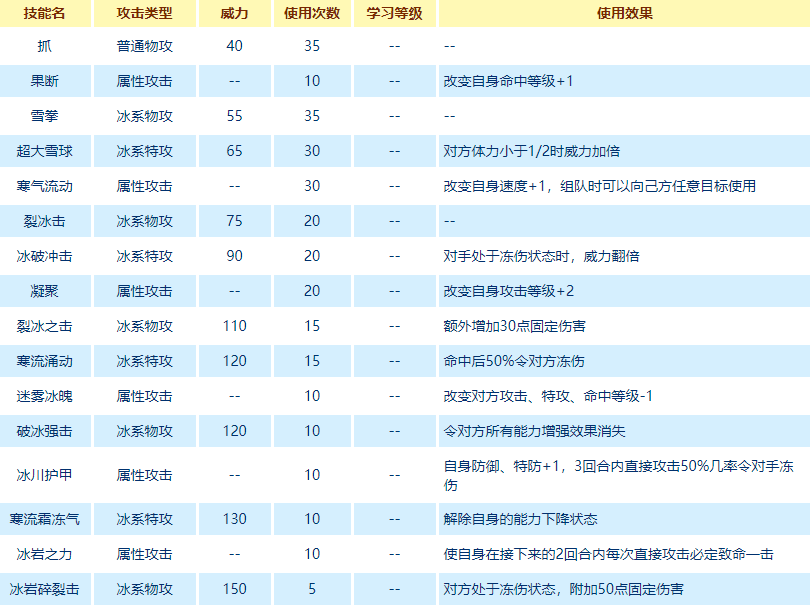 PP十,改变敌方精灵攻击和特攻,命中减一,破冰强击:伤害100,PP十,让敌方精灵的所有能力增强消失,冰川护甲:伤害零点,PP十,自己的精灵防御和特殊防御加一,三轮直接攻击50%冻伤敌方精灵,寒流霜冻气:伤害100,PP1,解除自己精灵能力下降,冰岩之力:伤害零点,PP十,让自己的精灵接下来两轮攻击触发致命一击,冰岩碎裂击:伤害100,PP5,敌方精灵冻伤害5。