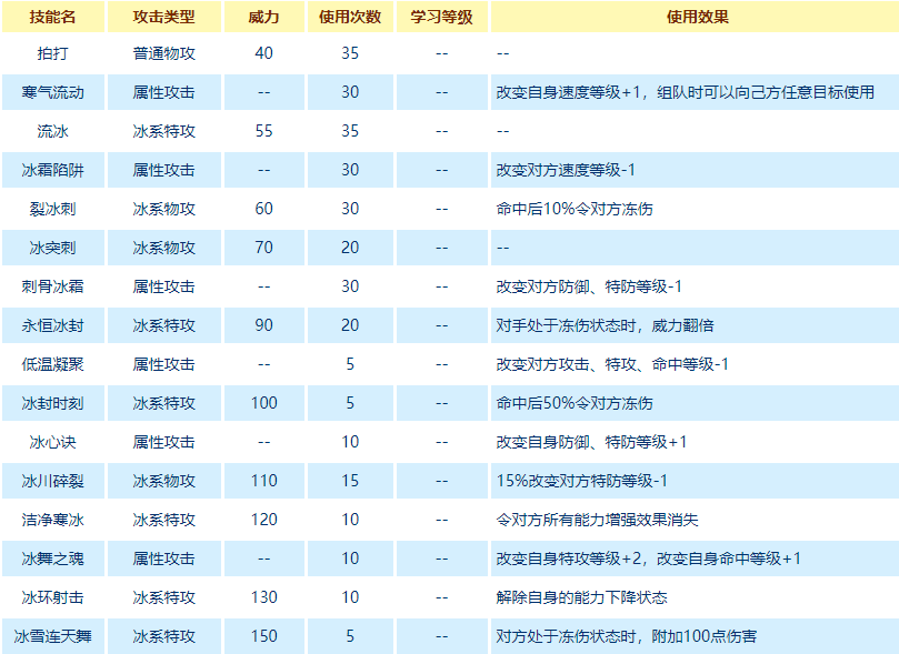 PP十五,命中后百分之五十让敌方精灵冻伤,迷雾冰魄:伤害零点,PP十,改变敌方精灵攻击跟特攻以及命中减一,破冰强击:伤害壹佰二,PP十,让敌方精灵所有的能力增强消失,冰川护甲:伤害零点,PP十,己方精灵防御跟特防加一,三回合里直接攻击百分之五十让敌方精灵冻伤,寒流霜冻气:伤害壹佰三,PP十,解除己方精灵能力下降,冰岩之力:伤害零点,PP十,让己方精灵接下来两回合攻击触发致命一击,冰岩碎裂击:伤害壹佰五,PP五,敌方精灵处于冻伤附带五十点固伤。