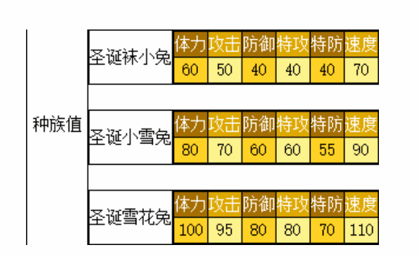 圣诞雪花兔技能解析,种族值怎么样?本期分析的精灵是圣诞雪花兔。我们来看看这个精灵的种族价值和技能。圣诞袜兔种族价值:血量60,攻击50,防御40,特殊攻击40,特殊防御40,速度70。圣诞雪兔种族价值:血量80,攻击70,防御60,特殊攻击60,特殊防御55,速度90。圣诞雪花兔种族价值:攻击95,防御80,特殊攻击80,特殊防御70,血量10,速度10,能力价值:攻击641,防御581,特殊攻击523,特殊防御541,血量871,速度771。