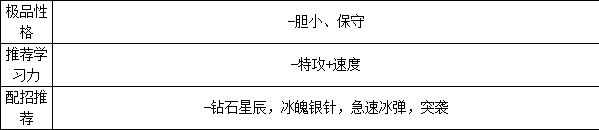 一个种族值一般的亚比,技能上虽然攻击类技能很多,但没有加攻技能,只能算一般吧。建议配招:钻石星辰,冰魄银针,快速冰弹,突袭,尖钻冰刺等等。建议种族:速度,特殊攻击。尽管其攻击种族较高,但其技能尖刺是特殊攻击,因此建议刷特殊攻击。