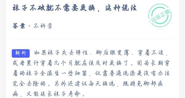 袜子是很多人每天需要穿的,在以前,人们一双袜子往往穿到破了才扔,现在人们对袜子的追求越来越高,但是还有很多人习惯性的保留节俭习惯,不坏就不会换袜子。今天蚂蚁庄园就是问大家袜子不破就不需要更换这种说法对吗?