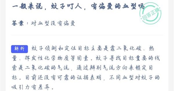 随着温度越来越高,蚊子又大肆猖獗了起来,伴着着烦人的“嗡嗡嗡”,赶不走,杀不尽,很多人会吐槽自己受蚊子欢迎,是蚊子偏爱的血型。今天蚂蚁庄园就是问大家,一般来说蚊子叮人有偏爱的血型吗?