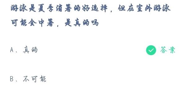 天气逐渐开始变得炎热,游泳变成了广受欢迎的消暑运动,许多人都会去游泳馆或者室外池塘、河流等地方游泳。今天蚂蚁庄园就是问大家,游泳是夏季消暑的好选择,但在室外游泳可能会中暑,是真的吗?