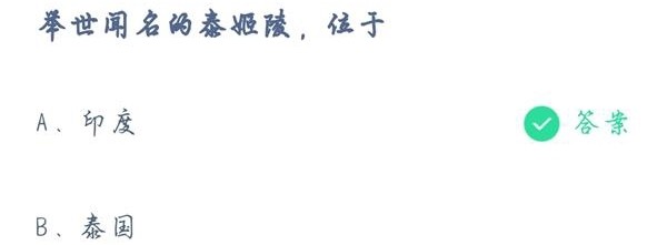 泰姬陵是世界闻名的建筑景点,被誉为世界上最美的陵墓,爱情的象征,世界上最浪漫的地方之一,每年都有很多人慕名前去参观。今天蚂蚁庄园小课堂就是问大家,举世闻名的泰姬陵在哪里?