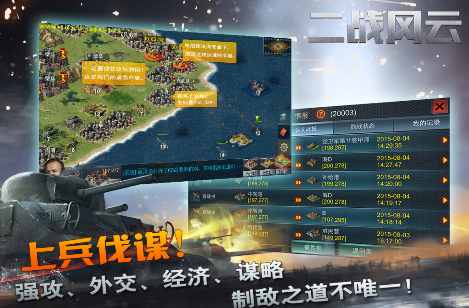 《二战风云》是一款社交战略网游!游戏以二次大战为背景,结合城市建造、资源经营、组建军队、军团养成等一系列玩法,供您尽情施展策略、比拼智谋,最终打造一个属于您自己的强大帝国!