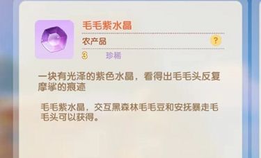 摩尔庄园毛毛紫水晶是一块拥有光泽的紫色水晶,上面被毛毛头反复摩擦的痕迹还清晰可见,毛毛头可真有意思。那么摩尔庄园毛毛紫水晶怎么获得呢?下面小编就向大家带来毛毛紫水