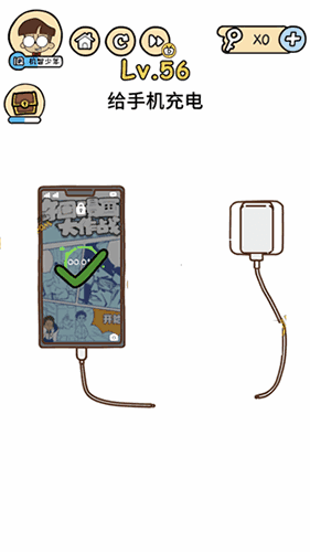 脑洞大大大是一款多个关卡的有趣的休闲益智手游,那么其中第56关给手机充电答案是什么,下面一起来看看吧。