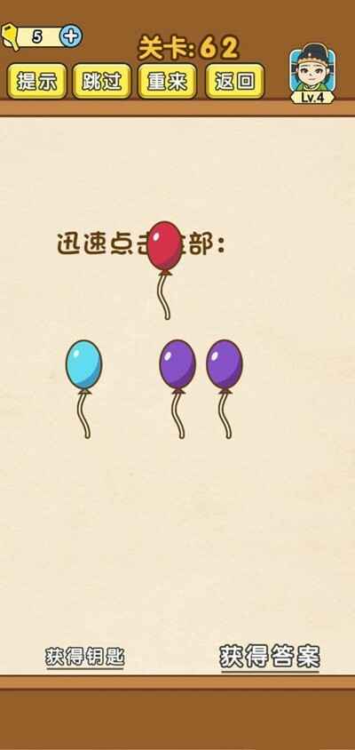 全民烧脑是一款奇特的有着多个关卡的休闲益智解谜手游,那么其中第62关迅速点击全部气球答案是什么,下面一起来看看吧。