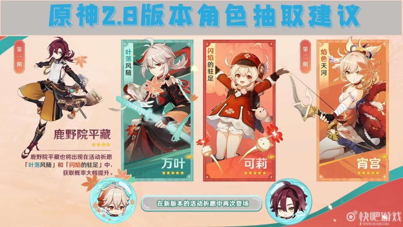快来瞧瞧万叶、可莉和宵宫之间的取舍吧!下面小编为大家整理了2.8版本UP的几位角色的总结性分析,以及给出角色的抽取建议,仅供大家参考哦!