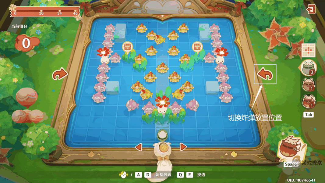 原神嘟嘟可轰轰奇遇记第四天我们需要先使用棕色炸弹,然后将其放置到红框位置,这样我们就可以炸掉8个鱼了,,接下来我们就可以将嘟嘟切换到左侧并换成绿色炸弹就可以了,下面来看看