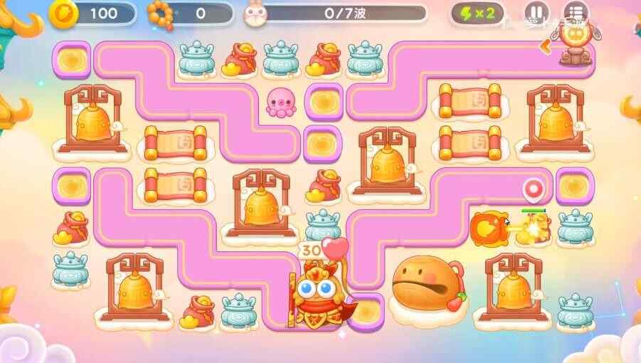 保卫萝卜4周赛10.7开局我们只需要在右边放置一个火瓶打钱袋来赚钱,中上方则放章鱼来防守,等三个粉兔打完了再打钱袋,然后升级章鱼来打大钟,后面我们可以放置更多的火瓶这样防守