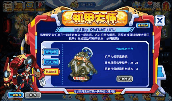洛克王国机甲大师渊博是本周的第三个活动,我们需要分三步来完成这周的活动内容,第一步就是制作零件,第三步级装升级,第三步就可以参加比赛了,只有赢得了比赛的最后胜利你就可以获