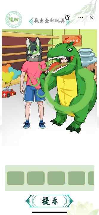 汉字找茬王玩具达人需要我们找出全部玩具,如果你还有一颗童心那么对这些玩具一定不会陌生,我们需要在这个关卡中将全部的玩具给找出来,只有这样你才能证明自己是一个正常的大人