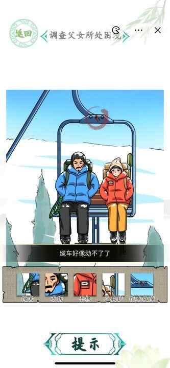 汉字找茬王调查父女所处困境是缆车求生关卡中我们需要面临的问题,在游戏中我们要帮助这对父女找出他们所存的困境,只有将正确的困境找出来我们才能更好的配合工作人员进行施救