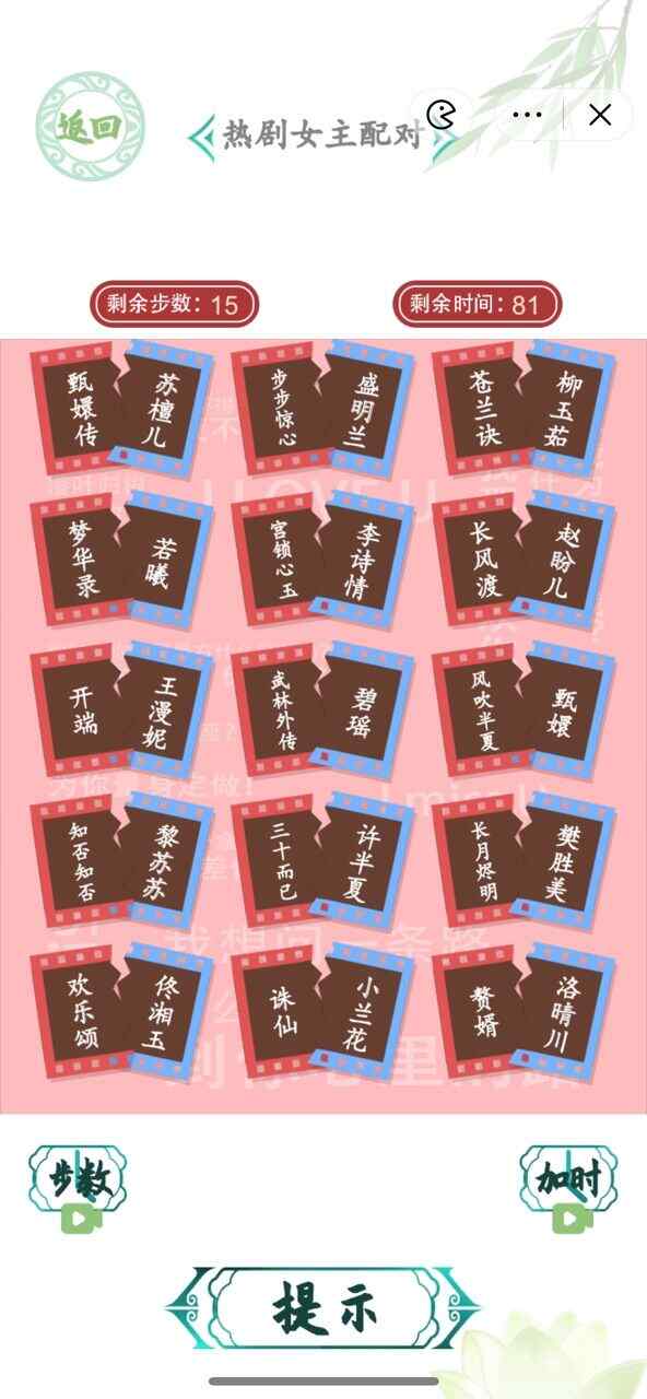 汉字找茬王热剧女主配对需要我们将各热门电视剧中的女主找出来,这里有大家熟悉的甄嬛传还有苍兰决等大家喜欢的电视剧,如果你是80、90后,相信这些电视剧你一定很熟悉了,