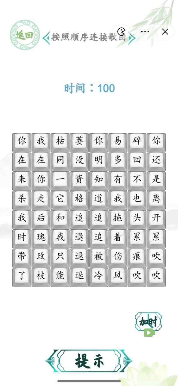 汉字找茬王九叔易碎需要我们按顺序将歌曲连接起来,让它成为一首完整的曲子,这首歌还是有一定韵味的,我们需要注意前两句比较长,我们在连的时候需要一气呵成,下面大西洋小编小编将