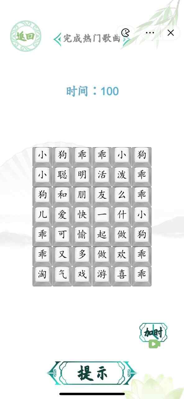 汉字找茬王小狗乖乖需要我们将这首网上流行的热门歌曲快速的连成一首完整的歌曲,本歌曲听起来还是蛮有趣的,连接也只需要六句就可以了,看起来很简单,但如果你对这首歌不太熟悉的