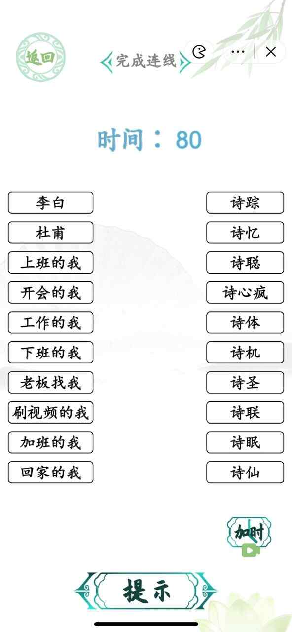 汉字找茬王诗人连线需要我们在规定的时间内完成对每诗人的不同称谓诠释给出正确的连线,相信看过长安三万里的小伙伴对影视中的名诗都是赞不绝口,那么除了诗仙和诗圣,我们还对其