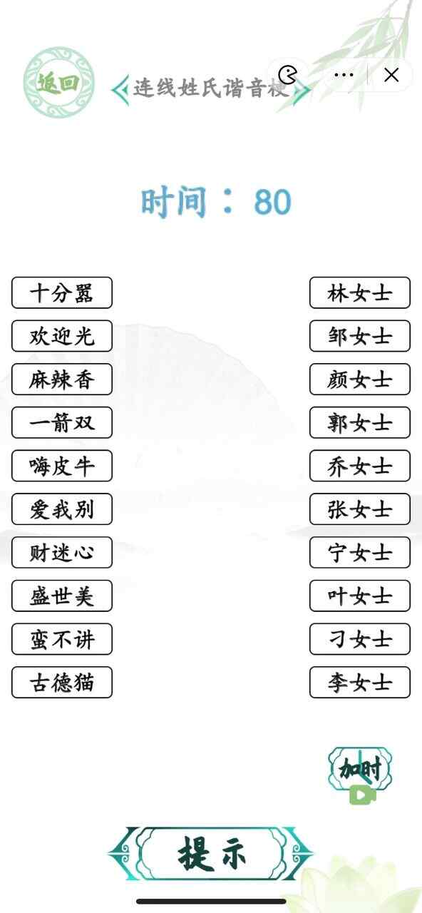 汉字找茬王连线姓氏谐音梗只需要我们在80秒的时间内将各种姓氏的谐音梗找出来就可以了,看来我们还需要多学习一些谐音梗,今天的这个姓氏谐音梗就让人大感意外,