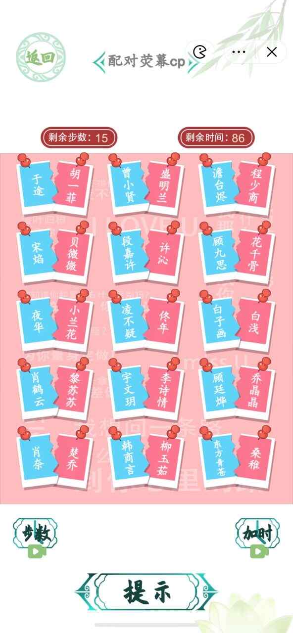汉字找茬王CP配对需要我们将荧幕中的每个人名进行正确的配对,如果你对这些名字还不是很了解的话,可以通过我们的正确配对CP答案来快速完成本关卡的挑战,让你更快知道每对CP是如
