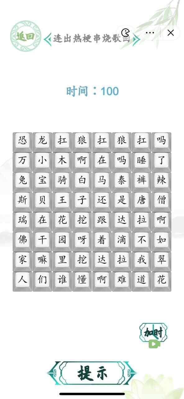 汉字找茬王连出热梗串烧歌是当前比较火的一首热梗串烧歌曲,我们如果对这首歌还不太熟悉的话是很难在短短100秒内快速连成一首歌曲的,就算有答案也是比较难,