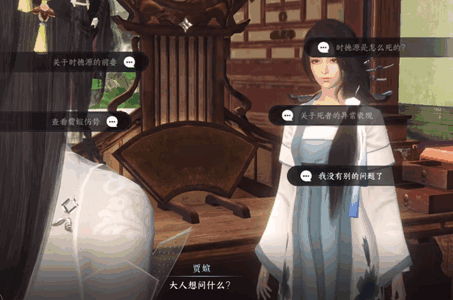 1、接取任务之后,一次询问屋子里的人(贾媗、贾晟、阿正)获得线索。