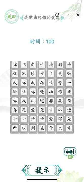 汉字找茬王连歌曲悲伤的爱情应该怎么完成正确的连线呢,这次我们所面临的挑战并不是很大,我们只需要知道其歌词基本上就能自行过关,但如果有我们的连线答案图本关卡将变得更加容