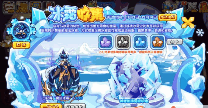 洛克王国冰霜收集活动在11月3日开启,在活动期间,大家可以通过完成占卜以及每日战斗挑战任务来获取魔法冰霜,大家在占卜的时候可以点亮水晶,点亮水晶越多,也就会获得更多的冰
