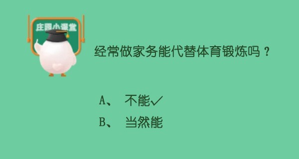 家务劳动是每个人每天必须面对的活动,拖地、洗碗、洗衣服等家务劳动做起来都比较累,所以很多人会觉得每天做家务已经很累,不需要专门进行体育锻炼了。今天蚂蚁庄园小课堂就是问