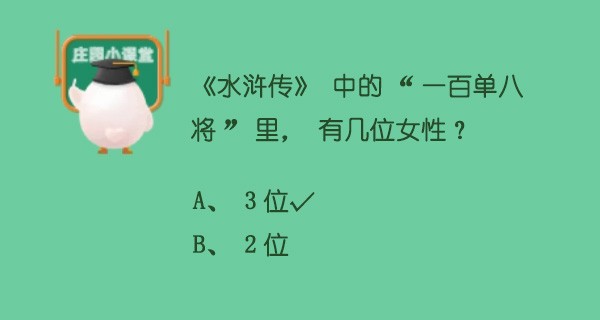 说到梁山好汉,很多人习惯性的反应就是一大帮糙老爷们,其实梁山108条好汉中是有几位巾帼不让须眉的女汉子的。今天蚂蚁庄园就是问大家,《水浒传》中的“一百单八将”里,有几位女