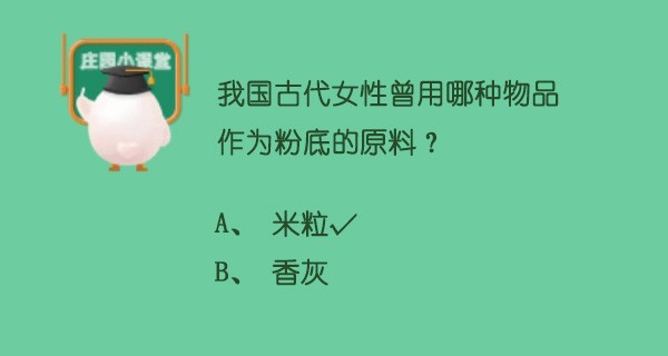 我们经常在古装电视剧中看到对着镜子化妆的大家闺秀,说明自古以来化妆术就存在,各种粉饼胭脂都是闺阁女子中常使用的。今天蚂蚁庄园小课堂就是问大家,我国古代女性曾用哪种物品