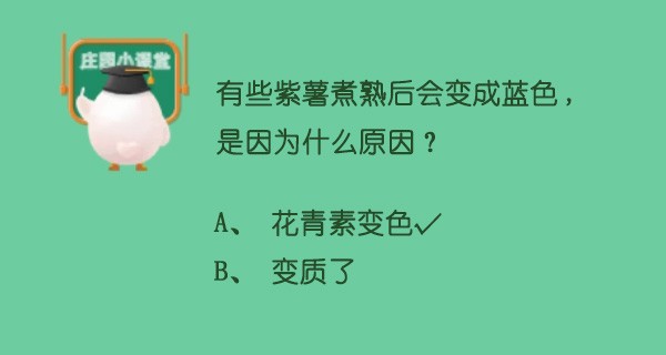 一般紫薯的颜色为深紫红色,有人在吃紫薯的时候会发现,紫薯煮熟后会变成蓝色,怀疑紫薯里面是不是添加了什么化学成分,不敢吃。今天蚂蚁庄园小课堂就是问大家,有些紫薯煮熟后会变成
