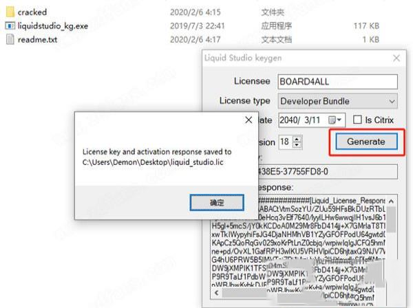 11、运行注册机liquidstudio_kg.exe,选择版本18,然后点Generate生成注册码,弹出提示即可