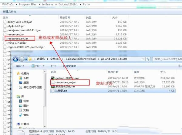 1、如果想汉化成中文,可以将软件包中汉化文件resources_cn.jar复制替换。打开安装目录下的“lib”文件夹,将原来的resources_en.jar英文版文件删除或重命名,再将汉化包“resources_cn.jar”复制入内即可,默认安装路径【C:\Program Files\JetBrains\GoLand 2019.1\lib】resources_en.jar重命名是为了返回英文界面,因为有用户说汉化不是很全面,但99%汉化好了。
